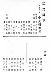 大きな活字の「恭賀新年」で始まり、大正6年1月 中央報徳会/理事長 早川千吉郎、ついで理事11名、監事2名、幹事5名が列記されたあと、 まさに一線を画してスタッフ(編集者)らしい8人の名があり、その二番目に「橋本八五郎」とあるではないか。
