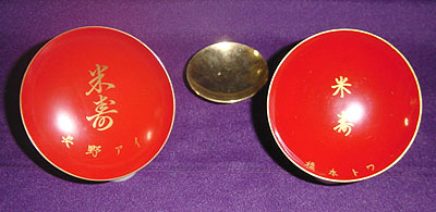 4人目は92年11月、名古屋市内の有料老人施設に住んでいたわが母トワで、その誕生日(3日)のために、 私はお祝いとして新宿伊勢丹でたった一つだけ、母の名を入れて作った朱の盃を届けた。 もちろん、祖母長野アイの名の入った盃も携えていった。二人だけのお祝いの儀式であった(私50歳)。